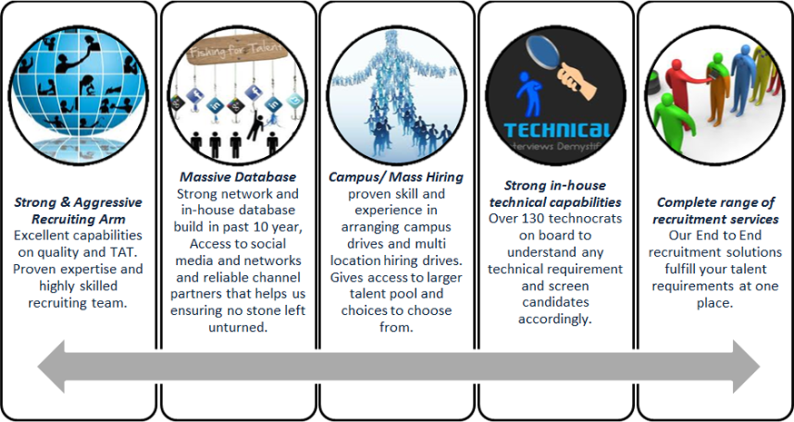 We are managing entire life cycle of a recruitment flow. From concept to execution, from need identification to role formation, from budgeting to job offer, from market research to interview, from sourcing to reference checks, we are capable of managing it all.